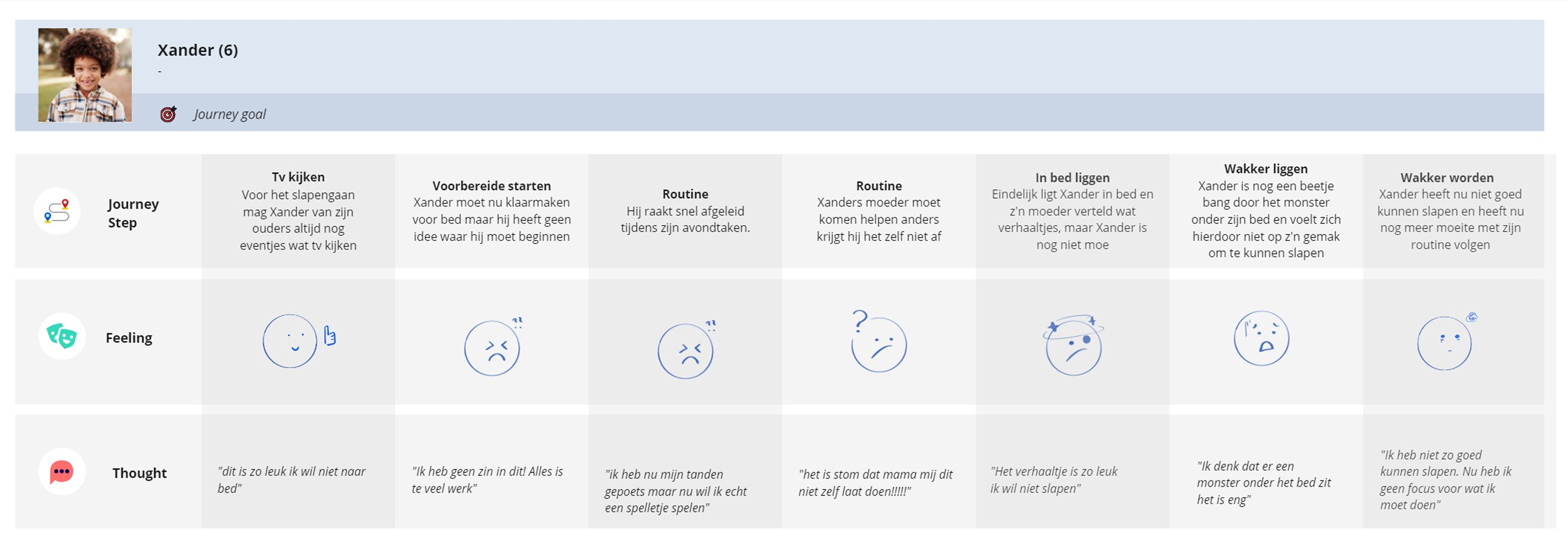 To reach a deeper understanding we also made a user journey. So we can have a guide for their needs. With the user journey we can grasp a better feel of the timeline and the emotions felt at the moment.