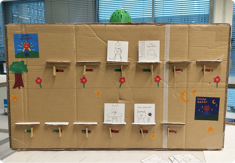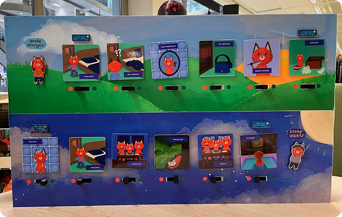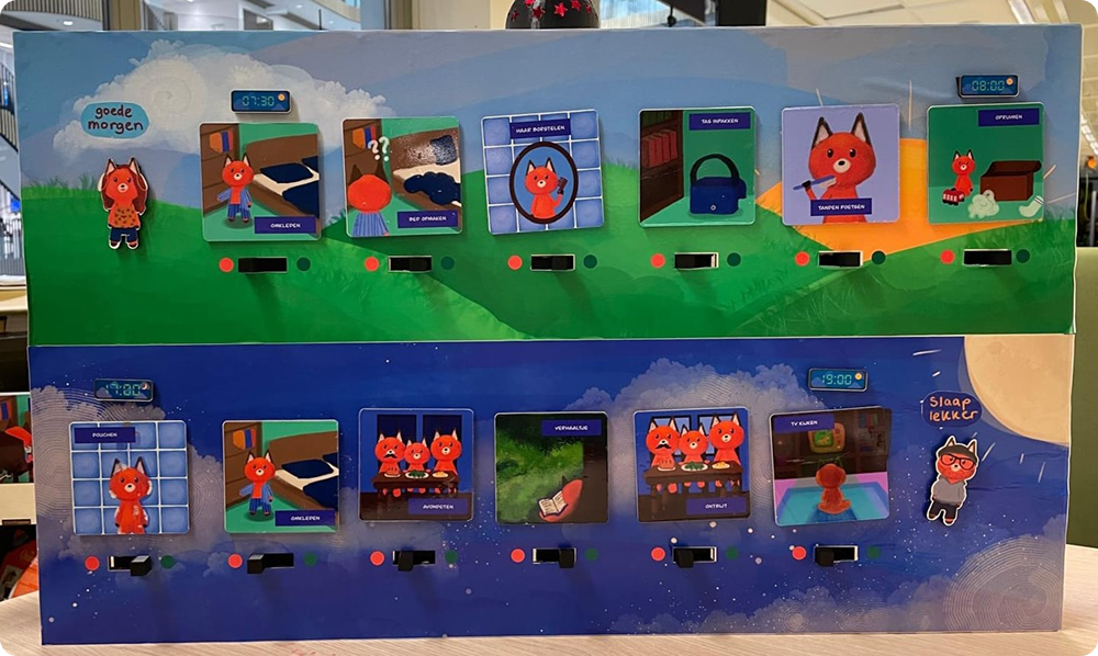 This board is divided into 2 parts: a morning routine and an evening routine. The day starts with a good morning from our character 'Puk', so you then go through your routine with him. We chose a fox instead of a human so that this can be inclusive for all types of children. The intention is to have many different types of these cards so that children have the freedom to create their own routine, because everyone has a different routine!