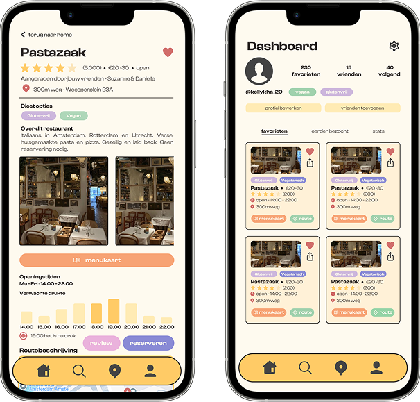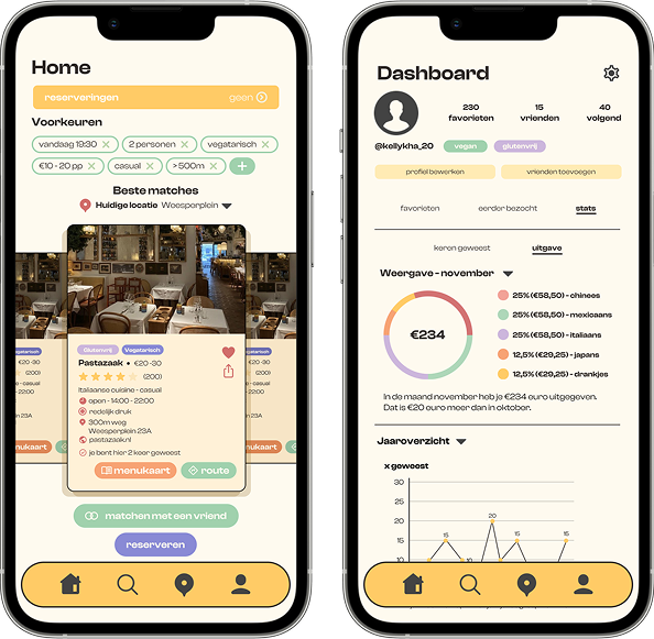 An app that helps users find restaurants that meet their preferences. These preferences include diet, crowds, location, price or previously visited restaurants.This way you can find a restaurant that suits your needs faster and without stress.