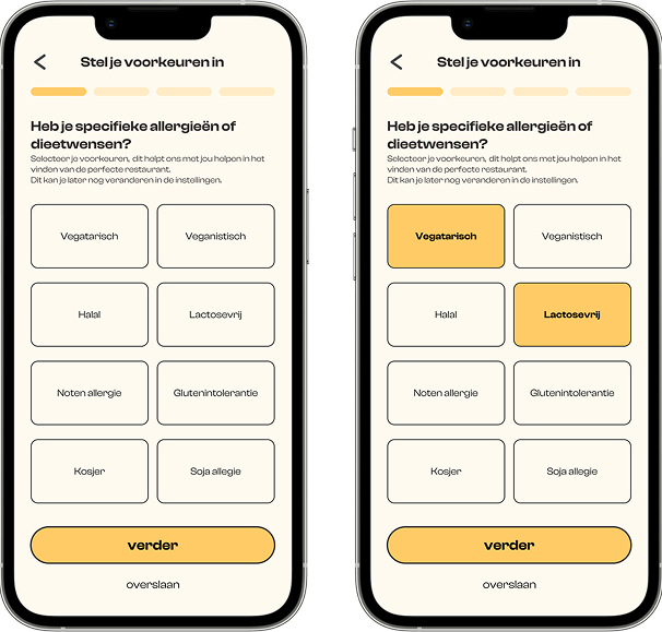 The dietary questionnaire screen allows users to specify their food restrictions and preferences. Users can select multiple options (as shown with the highlighted vegetarian and lactose-free selections) to personalize their restaurant recommendations.